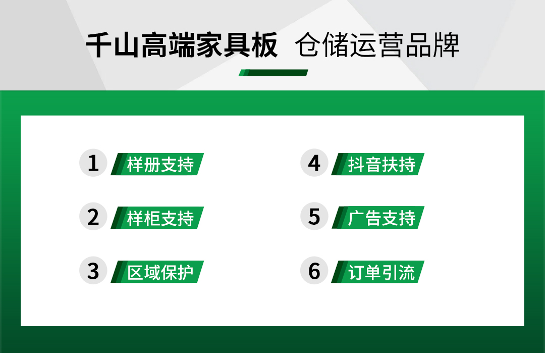 作為高端家具板倉儲運營品牌,千山依托家具板倉儲一體化運營模式,將持續為全國加盟商及消費者提供更優質的家具板產品與服務,期待更多的家具廠伙伴加入千山家具板倉儲運營事業,乘風并進,共謀發展!