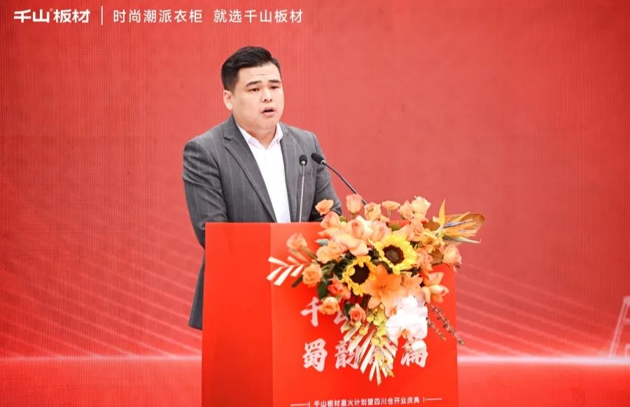 千山品牌事業部總經理王松發表致辭。王總表示,四川倉的開業,是繼山東倉之后,千山板材發展歷程中又一重要的里程碑,也是千山板材在四川發展的全新起點。千山將以此為契機,加強與四川區域所有合作伙伴的溝通與合作,實現品牌和銷量的雙提升。