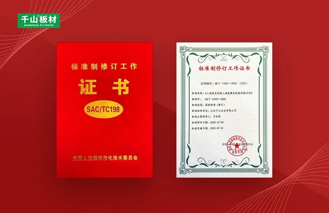 2023年3月,由全國(guó)人造板標(biāo)準(zhǔn)化技術(shù)委員會(huì)、中國(guó)林業(yè)科學(xué)研究院木材工業(yè)研究所、林業(yè)產(chǎn)業(yè)標(biāo)準(zhǔn)化國(guó)家創(chuàng)新聯(lián)盟主辦的《人造板及飾面人造板理化性能試驗(yàn)方法》等新頒布標(biāo)準(zhǔn)宣貫培訓(xùn)暨產(chǎn)業(yè)發(fā)展研討會(huì)在浙江南潯召開(kāi),千山應(yīng)邀出席并獲頒國(guó)家標(biāo)準(zhǔn)制修訂工作證書(shū)。