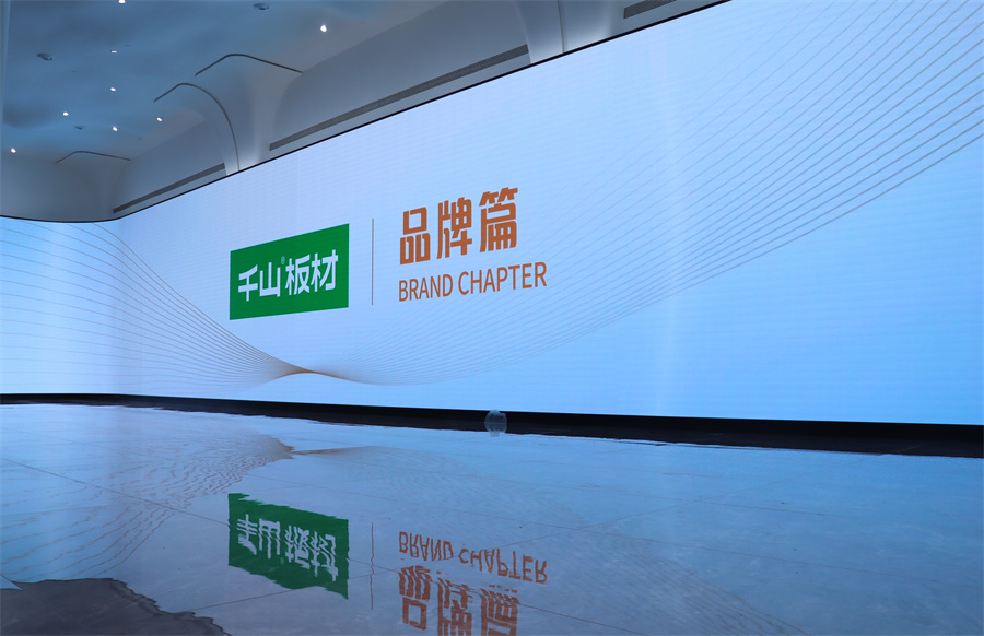 穿過正門大堂左側,迎面而來的是千山集團文化展示區,更是集團砥礪前行的生動敘事。超大LED屏高3.8m、寬27m,是目前臨沂最大的LED屏幕。宣傳片《千山筑夢》講述發展的故事,傳遞文化的自信,以集團全產業鏈、品牌、產品三大板塊發展成果為引線,串聯起千山過去二十六年的風雨輝煌路。