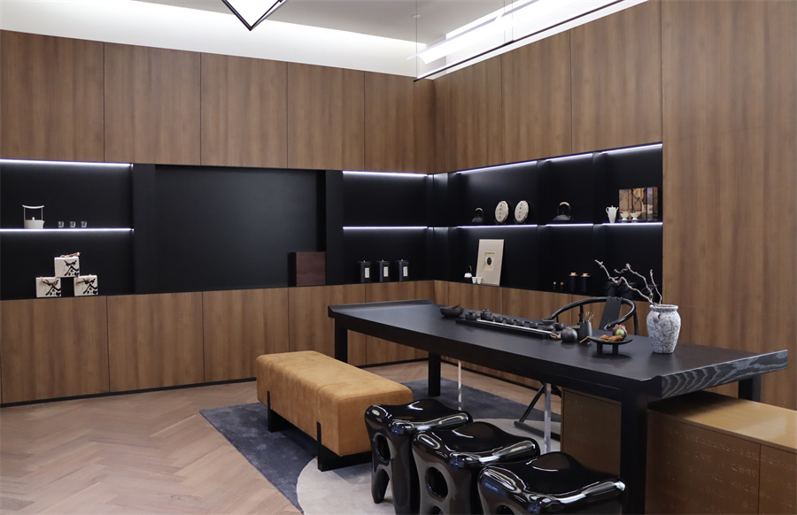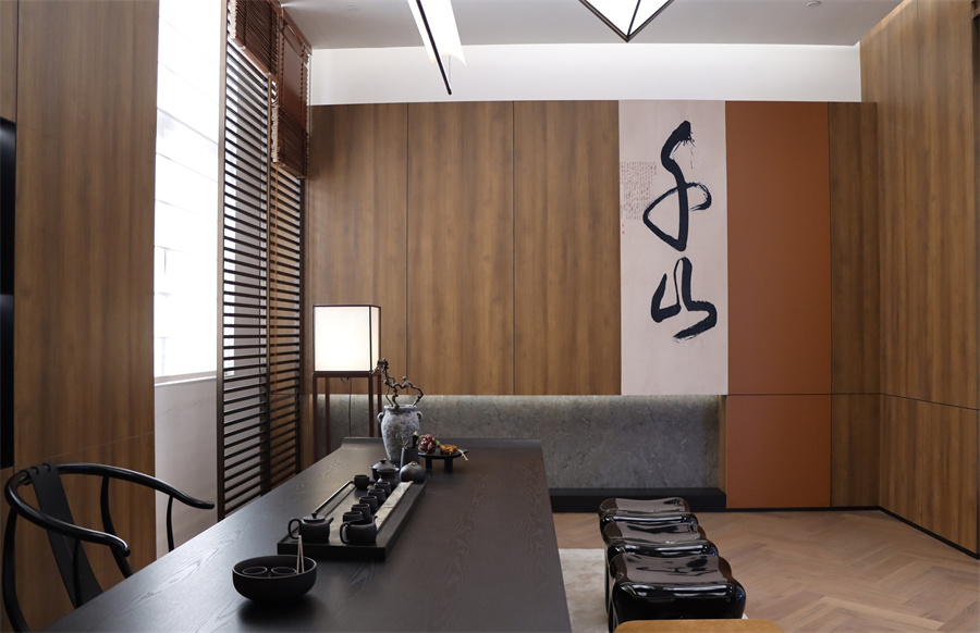 新中式風格茶室主體配色為門墻柜一體花色金色胡桃,其獨特木質紋理營造出自然質樸之韻,與木質護墻板與地板遙相呼應,兼具耐用性和溫暖質感。