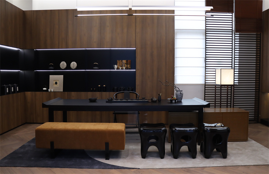 展廳五大空間呈現現代極簡、現代輕奢、新中式三大主流家裝風格,采用千山板材四大品類,糅合六大系列花色:木紋系列、純色系列、石紋系列、同步系列、數碼系列、PET系列,演繹多元化生活場景。