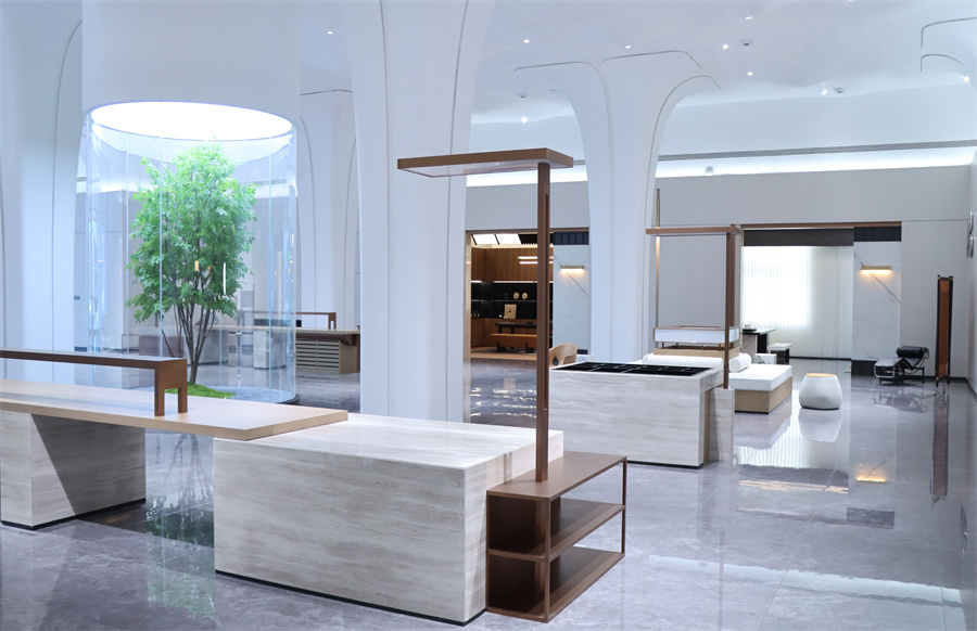 1500㎡現代美學空間,主中心以“生命之樹”為設計理念,營造自然與人文交融的場景化空間。吊頂以綿延的山脈形態表達千山砥礪深耕的工匠精神,樹冠形態的立柱寓意生命之樹的自然生長和璀璨綻放。