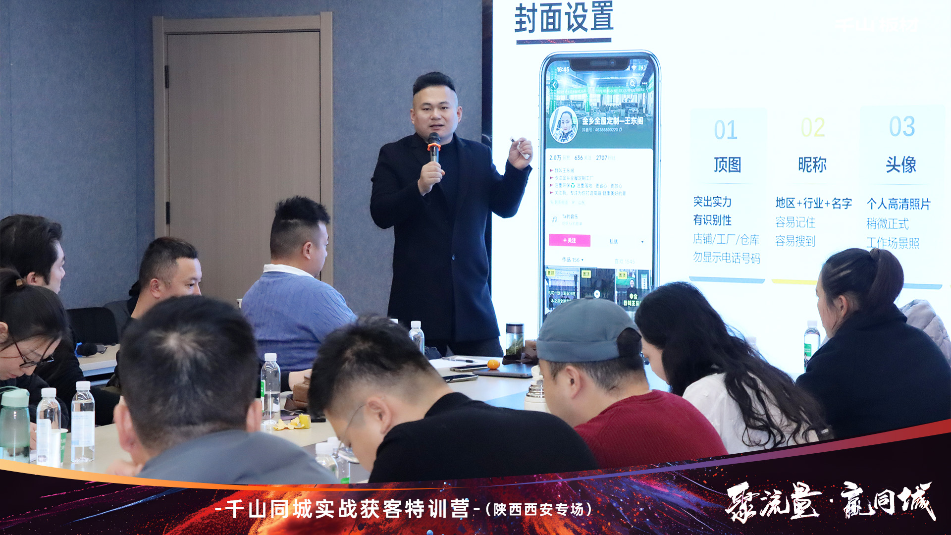 跟上新賽道風向,拓展流量致勝渠道。活動開始,千山板材陜西倉總經理王國棟致辭。王總表示:面對新媒體發展浪潮,我們要轉變營銷思維,積極布局抖音同城,打通線上的獲客轉化。