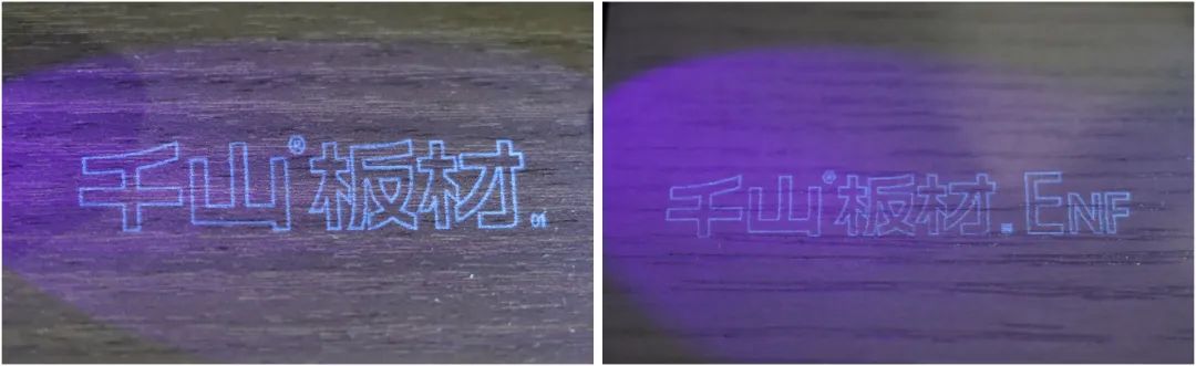 千山板材每張板材表面都印有隱形防偽標識,使用紫光手電筒照射板材表面,顯現“千山板材” 或 “千山板材ENF”。