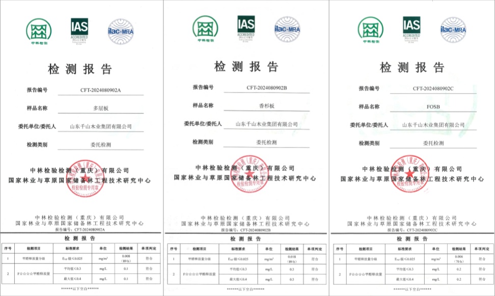 此次,千山板材實木多層板、實木香杉木板、實木刨片板均通過甲醛釋放量分級和F☆☆☆☆甲醛釋放量檢測,檢測數值均優于標準要求。