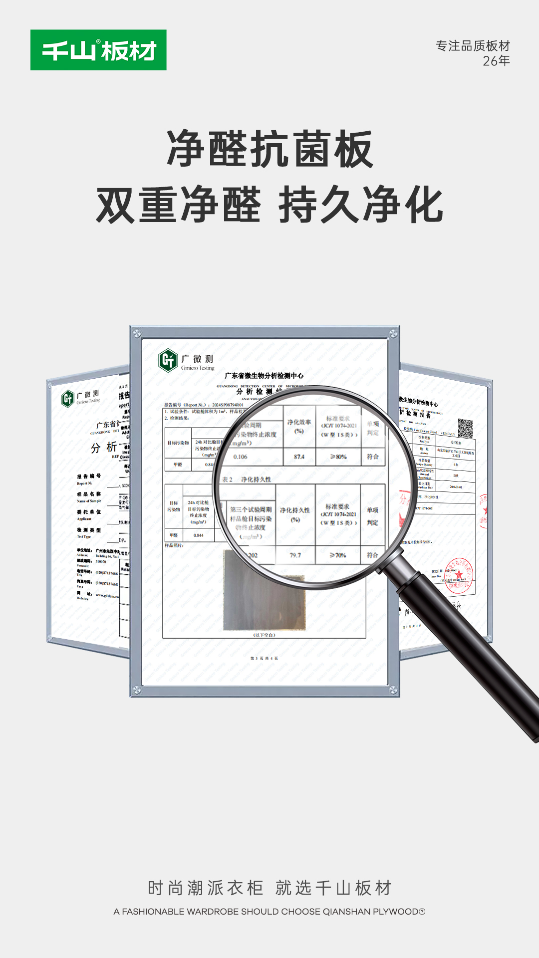 經權威機構檢測,凈醛板24h甲醛凈化效率為87.4%,凈化持久性達79.7%,抗(細)菌率、抗病毒活性率>99.99%,減少疾病傳播風險,為生活筑起免疫屏障。