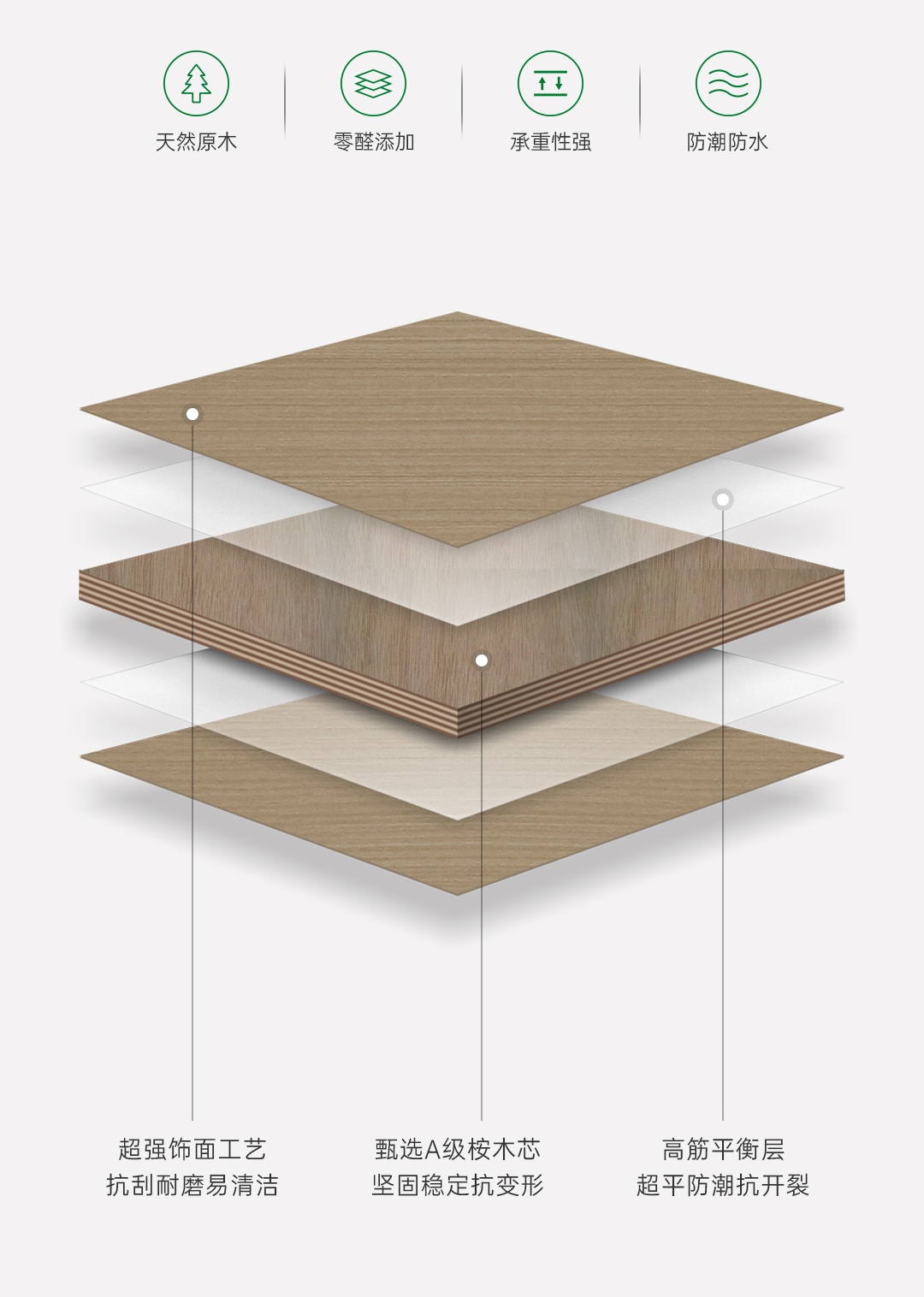 千山阻燃家具板甄選優(yōu)質(zhì)原木,確保成品板材的密度均勻,硬度更高,握釘力更強(qiáng)。內(nèi)芯11層結(jié)構(gòu),加厚單板縱橫交錯(cuò)鋪裝,保證板材的穩(wěn)定性能,膠合強(qiáng)度更高,使板材的抗壓性、承重力更為出色。優(yōu)質(zhì)基材經(jīng)過全周期養(yǎng)生、篩選、烘干、熱壓、砂光等24道標(biāo)準(zhǔn)工藝,并通過吸水膨脹率、耐濕、內(nèi)結(jié)合強(qiáng)度等多項(xiàng)專業(yè)檢測(cè),防潮抗變形,品質(zhì)更出眾。